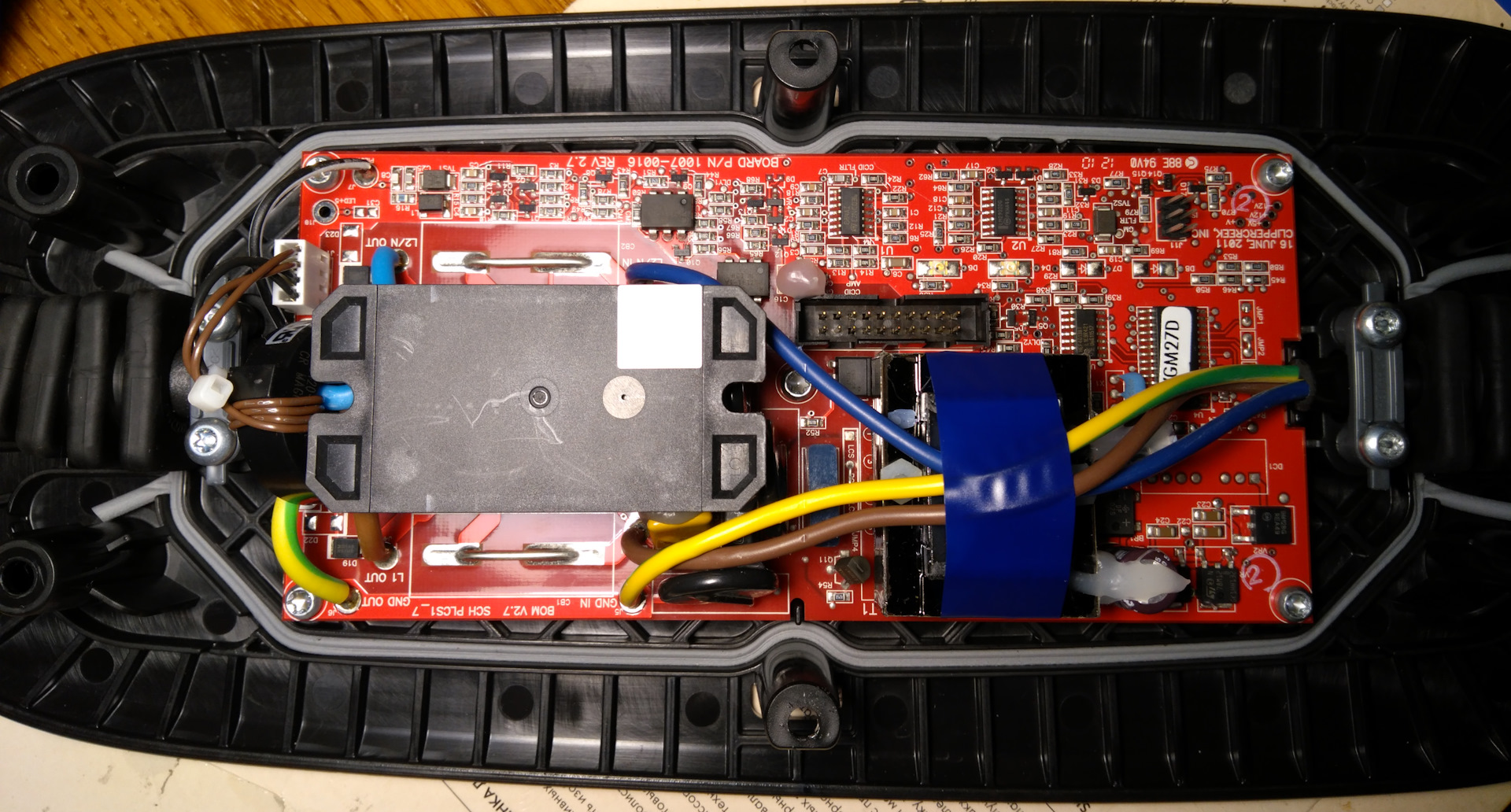 Домашнее зарядное устройство на 110 В изготовлено компанией Lear Corp и является «простым» компонентом, но его силовая электроника и программное обеспечение достаточно сложны, чтобы зарядка не происходила, если цепь, к которой он подключен, недостаточно заземлена. Реле зарядного устройства и плата контрольно-электронного оборудования сообщаются с аккумуляторной батареей и бортовыми системами мониторинга. И, как отмечалось ранее, встроенный модуль для преобразования питания от сети переменного тока в постоянный для зарядки батареи имеет свой собственный контур охлаждения.