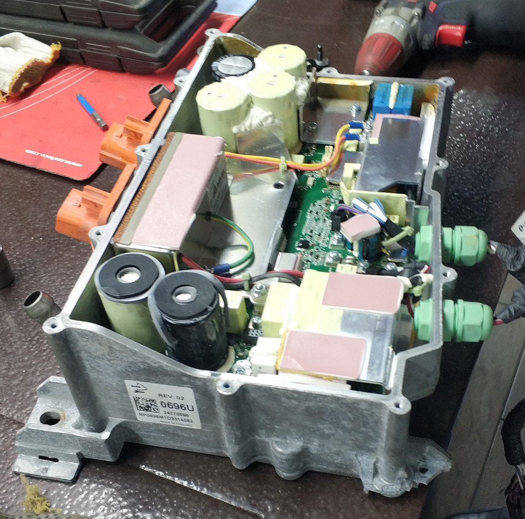 Зарядное устройство подключается к стандартной розетке за дверцей на левом переднем крыле. Джон Скотт-Томас утверждает, что разборка этого интерфейсного блока продемонстрировала внимание GM к деталям дизайна. Высоковольтные компоненты (то есть конденсаторы и синфазная колодка) в этой среде с высокой вибрацией были проклеены лентой и изолированы пеной для надежности и защиты, а обмотки были «прочными, стабильными и механически избыточными».
